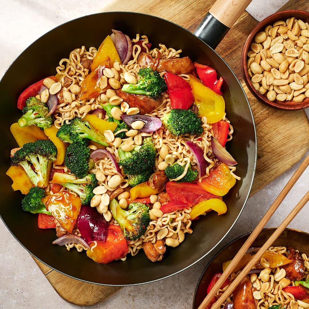 En färgstark och näringsrik wok med färsk kycklingfilé, krispig bimi och zucchini som serveras med fluffigt jasminris. Perfekt för matlådan.