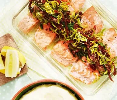 Lättlagad laxfilé som tillagas i ugn tillsammans med broccoli och serveras med kokt potatis och en lätt yoghurtsås.