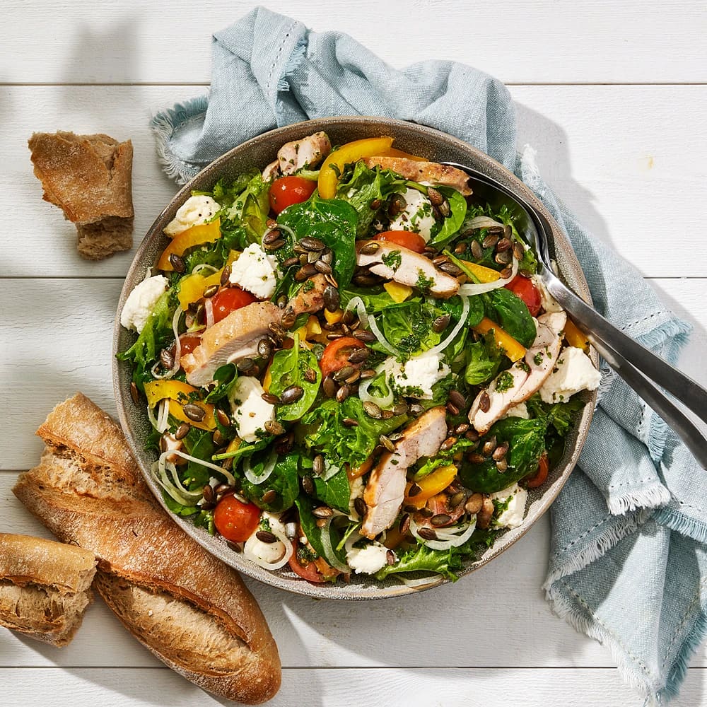 En färgstark och matig sallad med grillad kyckling, söt paprika, gurka och smulad fetaost.